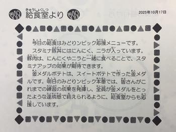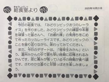 みどりンピック明けの給食は、毎年恒例のおつカレーライス(カツカレー)です。