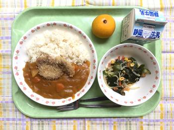 みどりンピックおつカレーライス じゃこわかめサラダ みかん ぎゅうにゅう