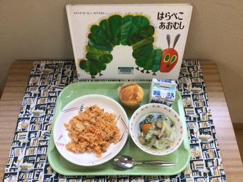 チキンライス ぐだくさんスープ はらぺこあおむしのどようびのカップケーキ ぎゅうにゅう
