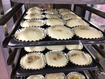 アルミカップに柔らかめの生地を流したら、炒めて味付けした肉あんを乗せ、最後にあんを覆うように再度生地を流して蒸します。