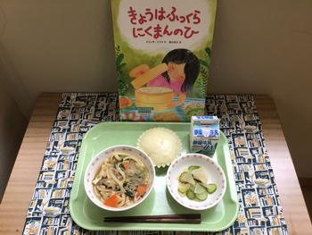 今日の読書メニュー「ふっくら肉まん」は、通常の肉まんのように生地にあんを包む作り方は難しいので、緑野小では肉まん風蒸しパンのような形で作ります。