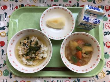 さけのだしちゃづけ にくじゃが りんご ぎゅうにゅう