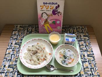 とりにくとごぼうのピラフ やさいスープ わかったさんのプリン ぎゅうにゅう