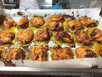 赤のタンドリーチキンは、鶏肉にカレー粉やケチャップなどの下味をつけて香ばしく焼きました。