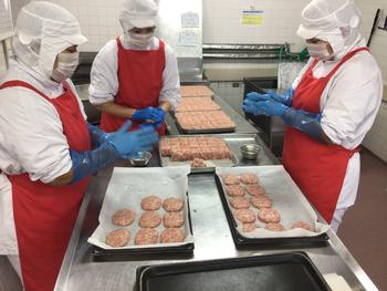 焼けたお肉をクラスごとに配缶したら、おろしだれをかけて提供します。