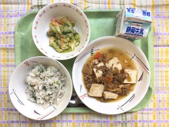 むぎいりなめし やきどうふのそぼろに ごまドレッシングサラダ ぎゅうにゅう