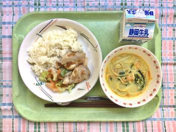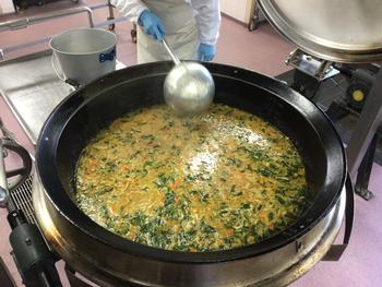 ラクサとは「多くの」や「ツルッとした」などの意味があります。ラクサには酸味系とクリーミー系の2種類の味があり、緑野小ではクリーミー系の「カレーラクサ」を作っています。えび、鶏肉、玉ねぎ、人参、油揚げ、小松菜が入り具沢山でスパイシーな味が刺激的で異国の情緒あふれています。