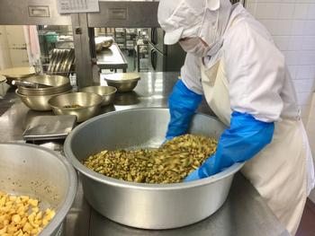 フルーツポンチはどの季節にも登場する定番ニューですが、最近ではみかん不足のため代わりに甘夏かんを使用する等、状況に合わせて内容も変更しています。甘夏のフルーツポンチは、みかんと比べると少しほろ苦い大人の味でしたが、皆おいしく食べていました。