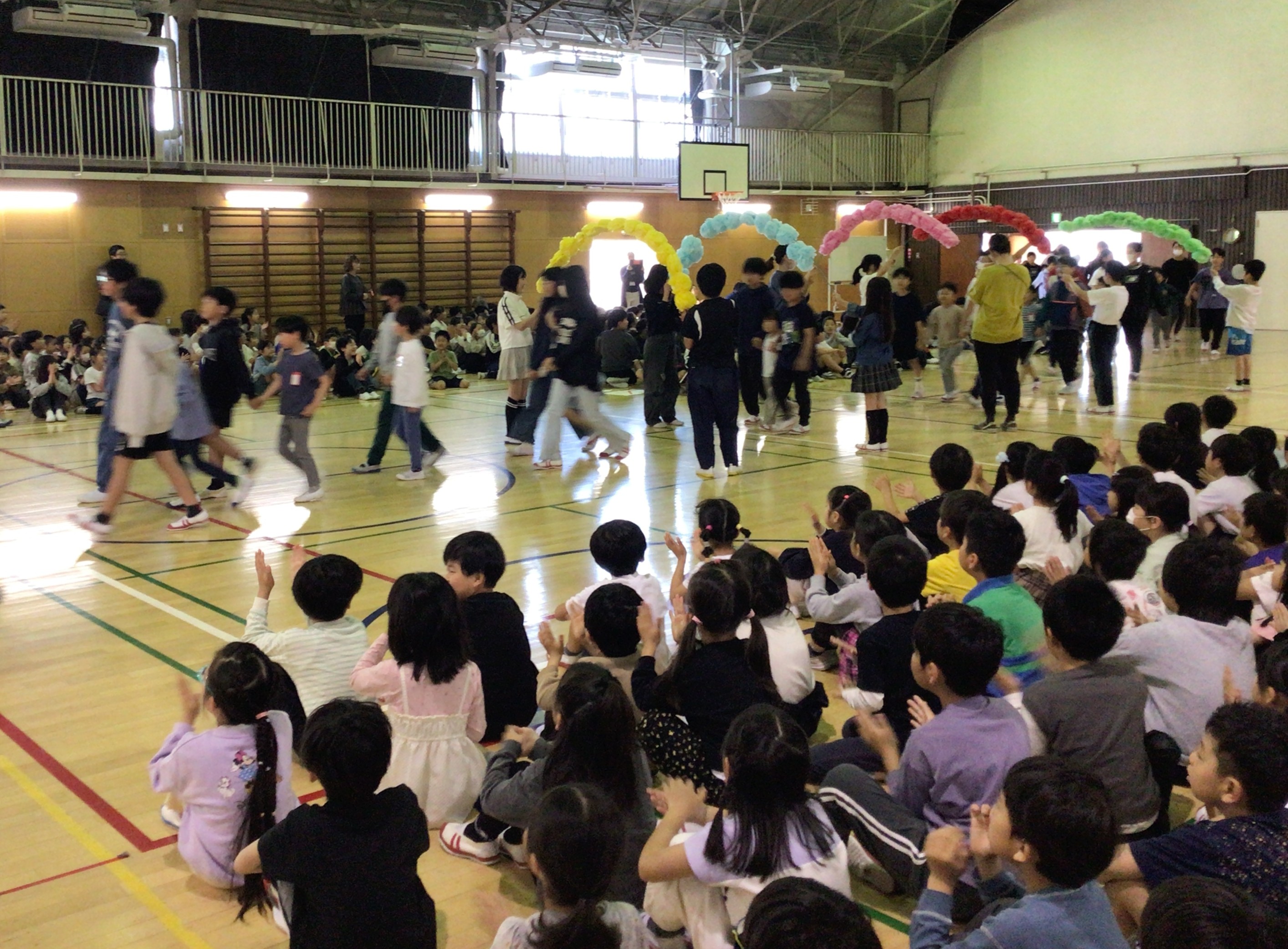 全校児童が体育館に集まり、1年生と6年生が手を繋いで入場しました。