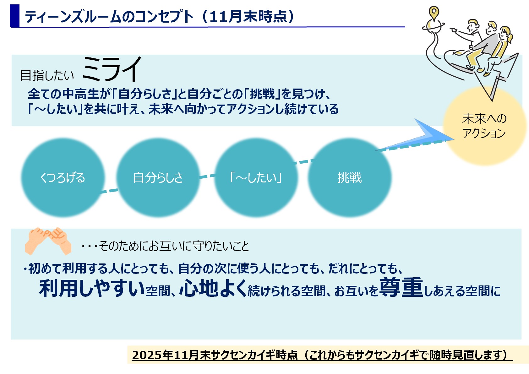 令和7年7月から4回にわたって「サクセンカイギseason1」を実施し、中高生の意見と、それを支える大学生サポーターの関わりにより、ティーンズルームに期待すること、レイアウトや設置する備品などを考えました。オープン後の11月からは、「サクセンカイギseason2」を実施し、利用してみて思ったことや、利用にあたってのルールづくりなどを話し合っています。
