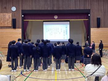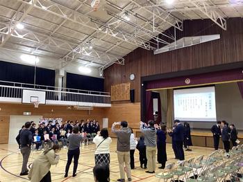 1組の太鼓の発表と卒業を祝う会が行われました。太鼓の発表会では、これまで練習を積み重ねてきた3曲を披露しました。リズムや動きが見事にそろい、気持ちを一つにした素晴らしい発表でした。卒業を祝う会では、在校生からのメッセージが送り、卒業生はこれからの決意を込めた誓いの言葉を述べました。1組の生徒、交流学級の仲間、保護者、地域の皆様、教職員など、多くの方々が参加し、会場全体が温かい雰囲気に包まれる心温まる会となりました。