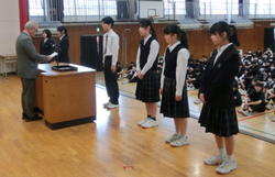全校朝礼にて、校長先生より前期委員会の生徒たちへ委嘱状が手渡されました。